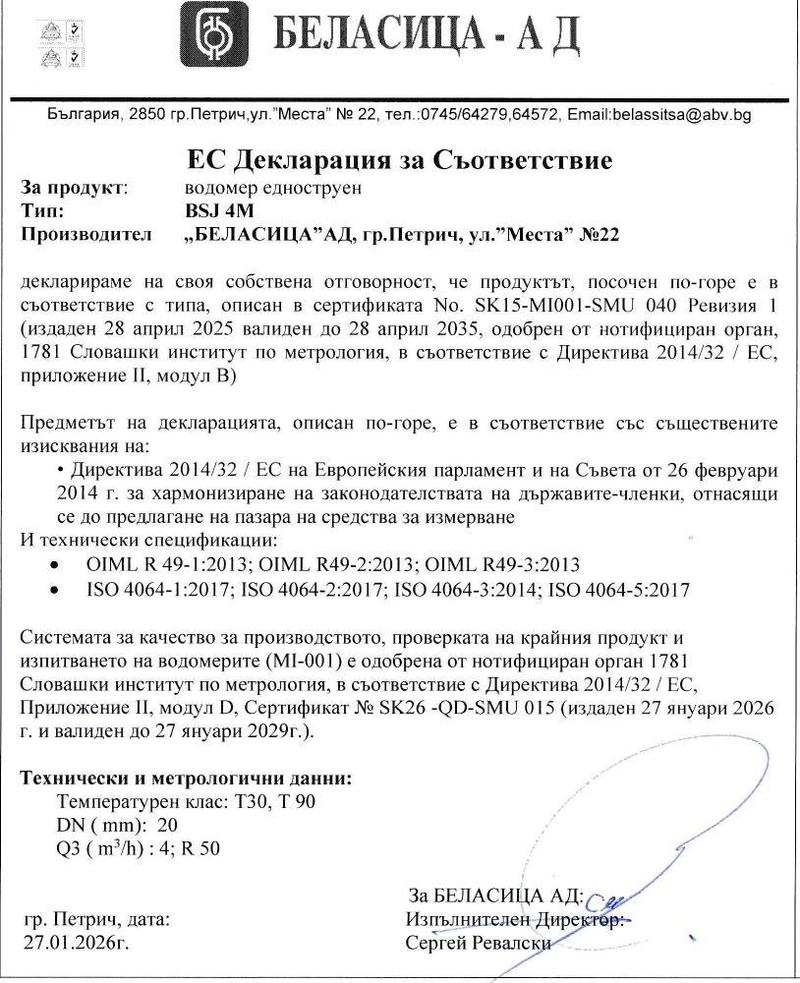 ЕС Декларация за Съответствие на Водомери едноструйни мокър тип BSJ 4M
