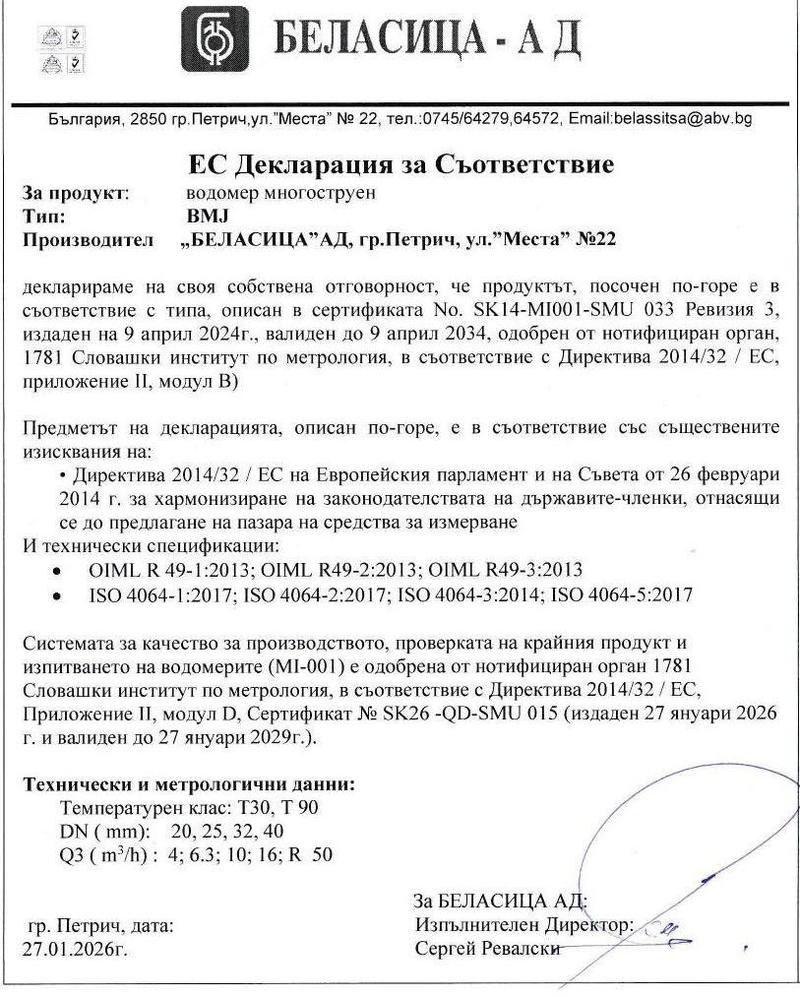 ЕС Декларация за Съответствие на Водомери многоструйни тип BMJ