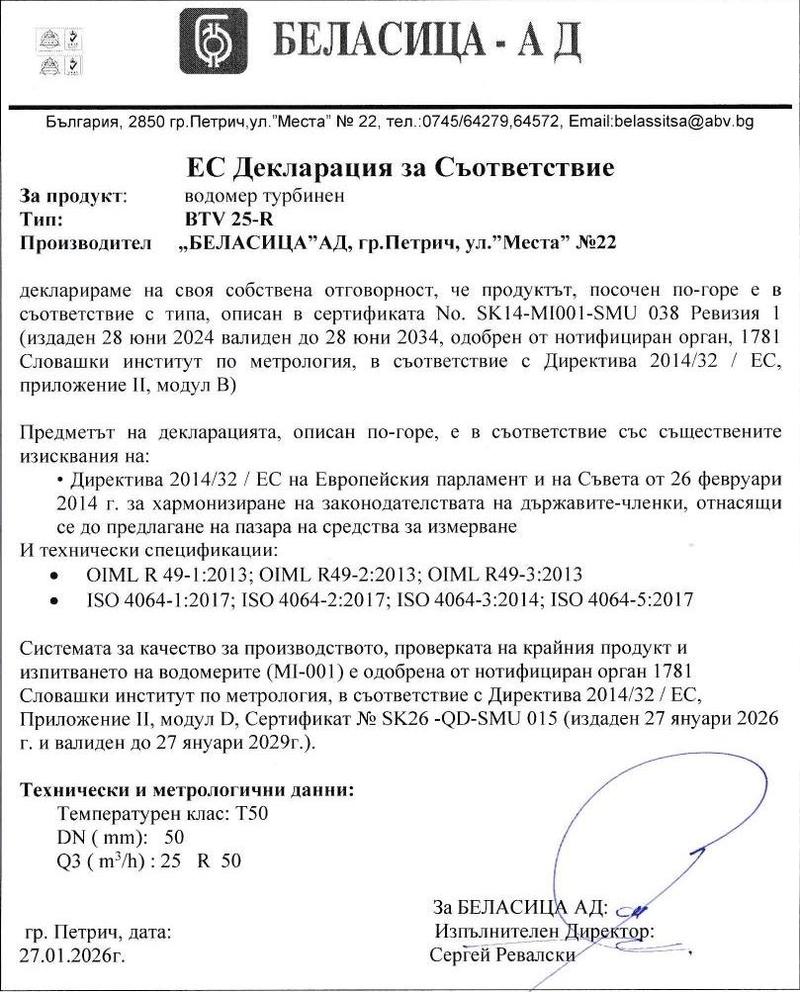 ЕС Декларация за Съответствие на Водомери турбинни тип BTV 25-R