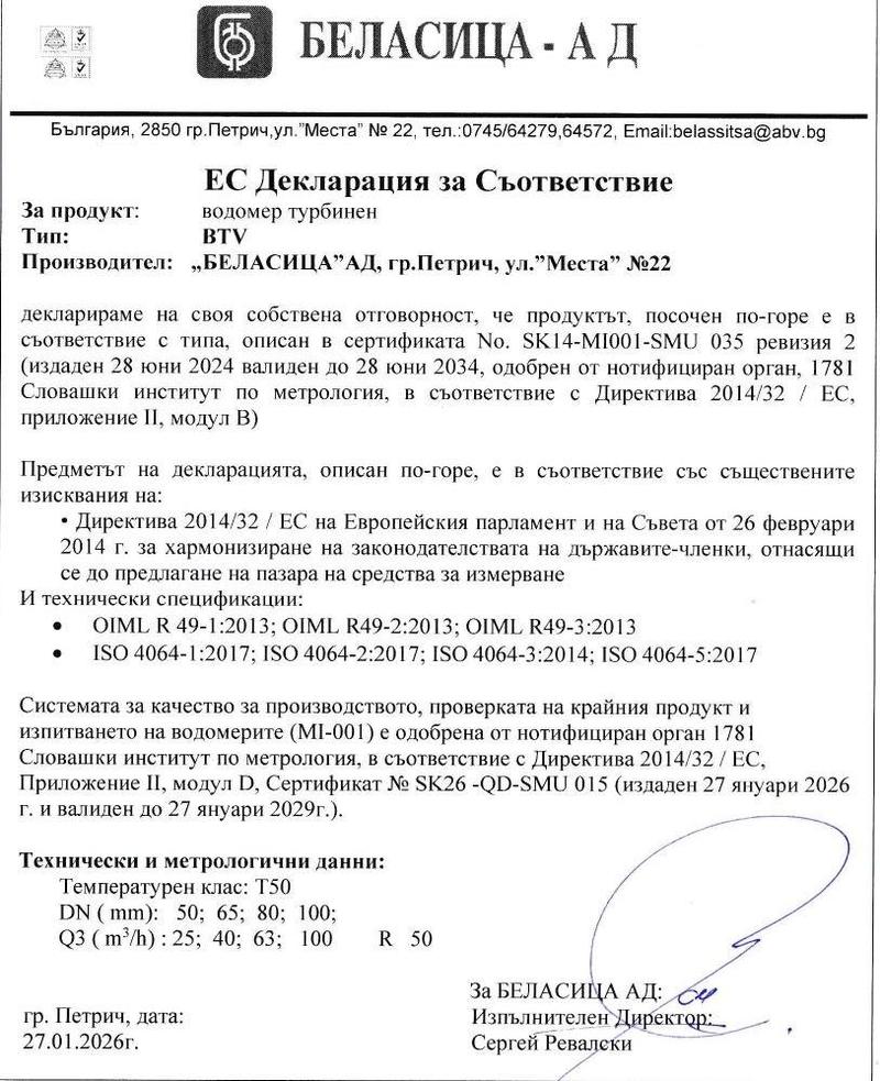 ЕС Декларация за съответствие на Водомери турбинни тип BTV