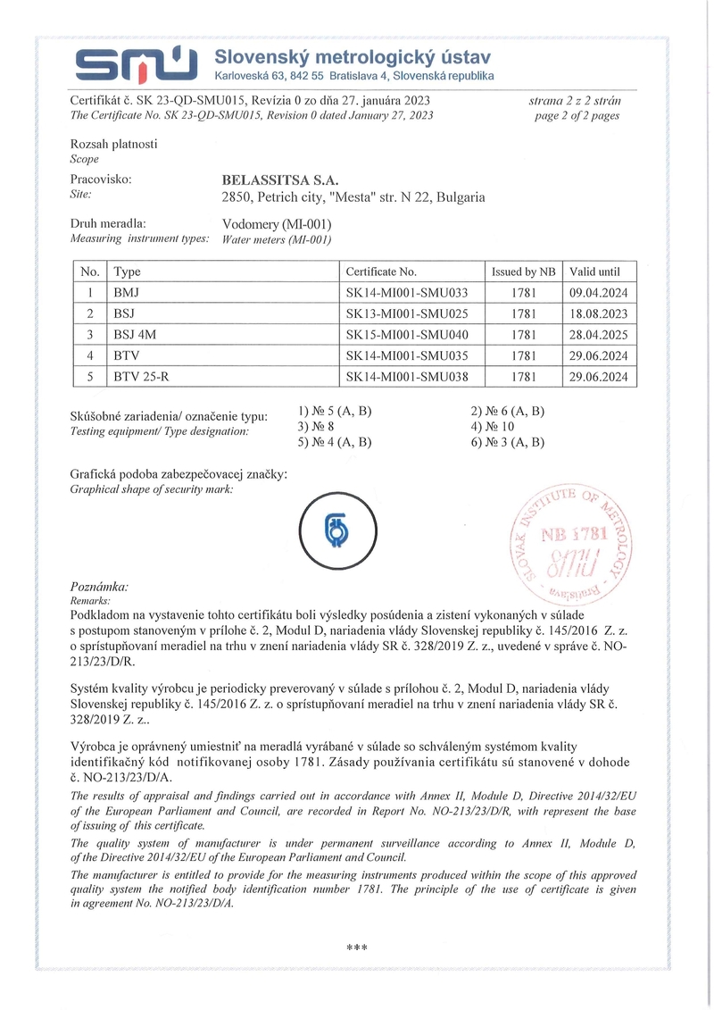Качеството на водомерите тип BSJ 2,5; BSJ 4; BSJ 4М; BMJ 4 ; BMJ 6.3; BMJ 10; BMJ 16; BTV25-R; BTV25; BTV40; BTV63; BTV 100 се основава на поетите ангажименти при оценката на съответствието за изпълнение на техническите изисквания и прилагане и поддържане на одобрената система по качество за производството, контрола на крайния продукт и изпитването на водомерите.